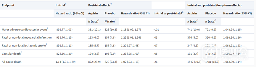 阿司匹林对MACE的影响在整个随访期间发生了变化。在试验后阶段,阿司匹林组MACE(HR 1.18,95%CI 1.02-1.37)及心肌梗死(HR 1.25,95%CI 1.01-1.54)的发生率较安慰剂组更高,而试验期间这些事件的发生率低于安慰剂组。