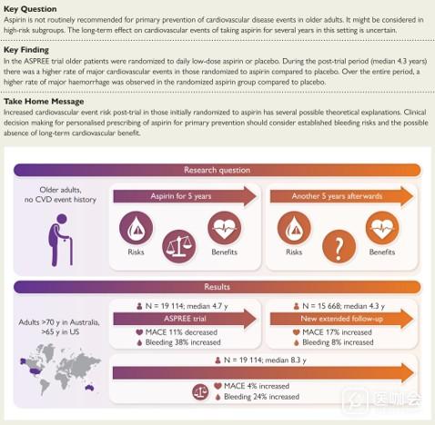 而且,长期随访中,阿司匹林与主要出血事件风险增加相关。但在试验后阶段,阿司匹林组的出血风险不再显著升高,与既往阿司匹林一级预防试验结果一致。