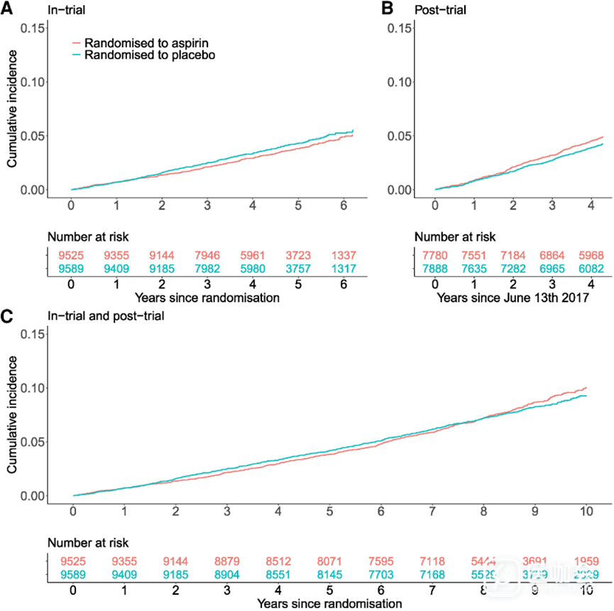 试验后效应:旨在评估多年每日服用阿司匹林作为一级预防策略对老年人群的试验后效应。使用ITT分析,将随访时间零点重置为试验后观察期的首日。