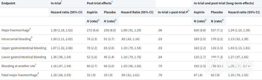 在整个随访期间,与安慰剂组相比,阿司匹林组出血事件发生率更高(HR 1.24,95%CI 1.10-1.39),上消化道出血(HR 1.43,95%CI 1.13-1.81)及其他部位出血(HR 1.25,95%CI 1.01-1.54)风险也显著升高。