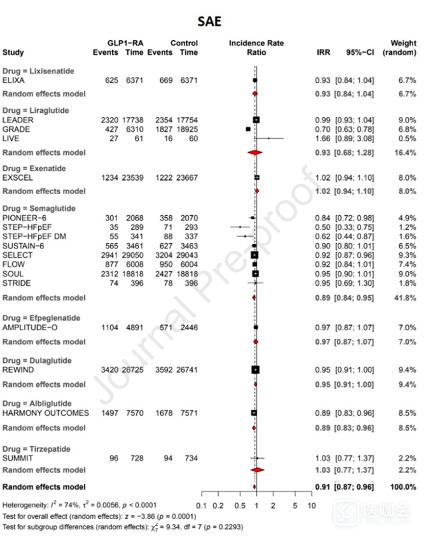 与对照组相比,GLP-1RAs组的严重不良事件显著减少(IRR 0.91;95% CI 0.87–0.96;p<0.01,NNH=92,GRADE:中等确定性证据)。不同亚组间无显著差异(交互作用p=0.21)。