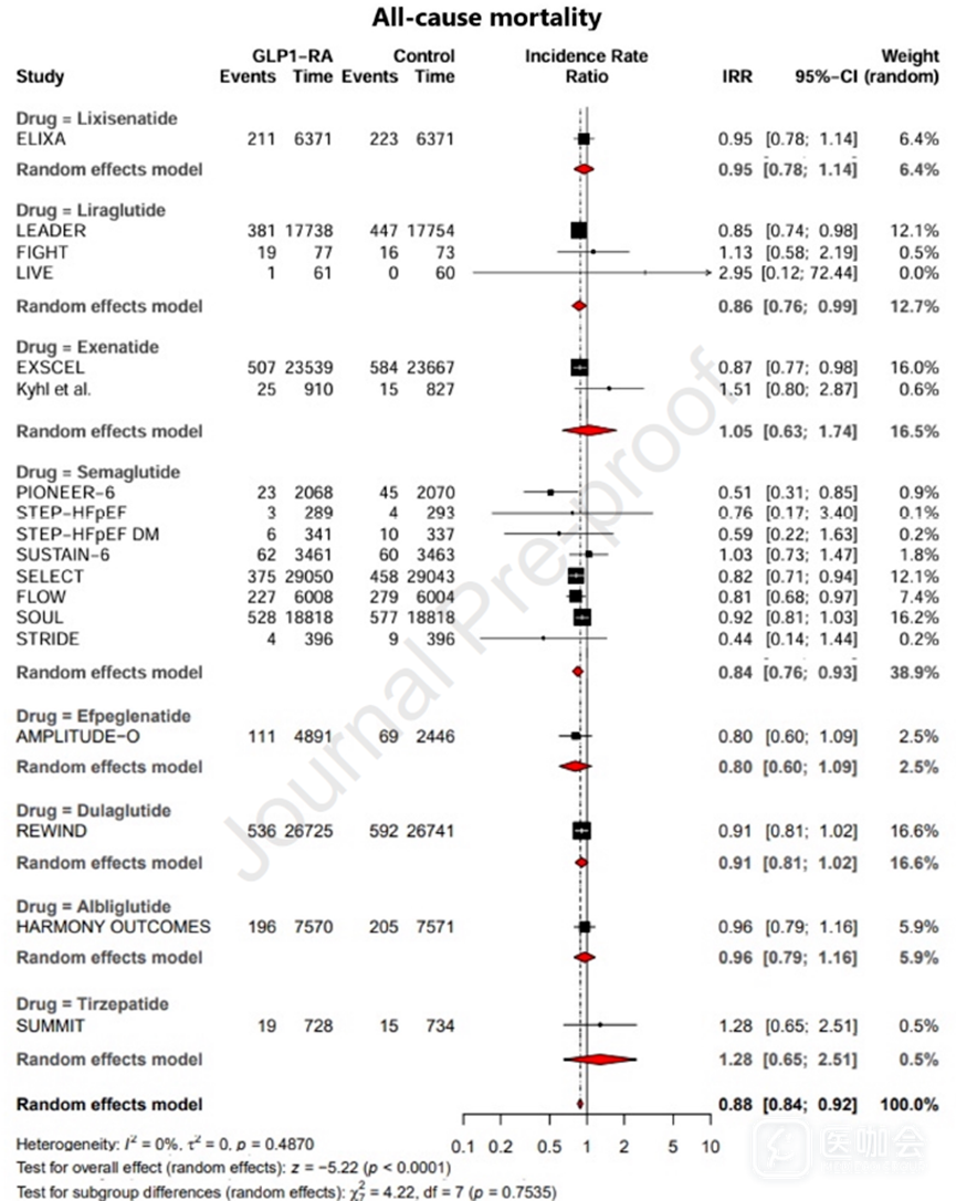 与对照组相比,GLP-1RAs组全因死亡率显著降低(IRR 0.88;95% CI 0.84–0.92;p<0.01,NNT=121,GRADE:高确定性证据)。不同药物亚组间无显著差异(交互作用p=0.77)。