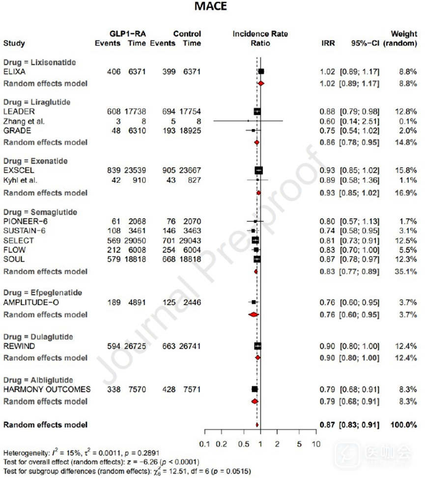 与对照组相比,GLP-1RAs组显著降低了MACE的发生(IRR 0.87;95% CI 0.83–0.91;p<0.01,NNT=66,GRADE:高确定性证据)。不同亚组间无显著差异(交互作用p=0.052)。