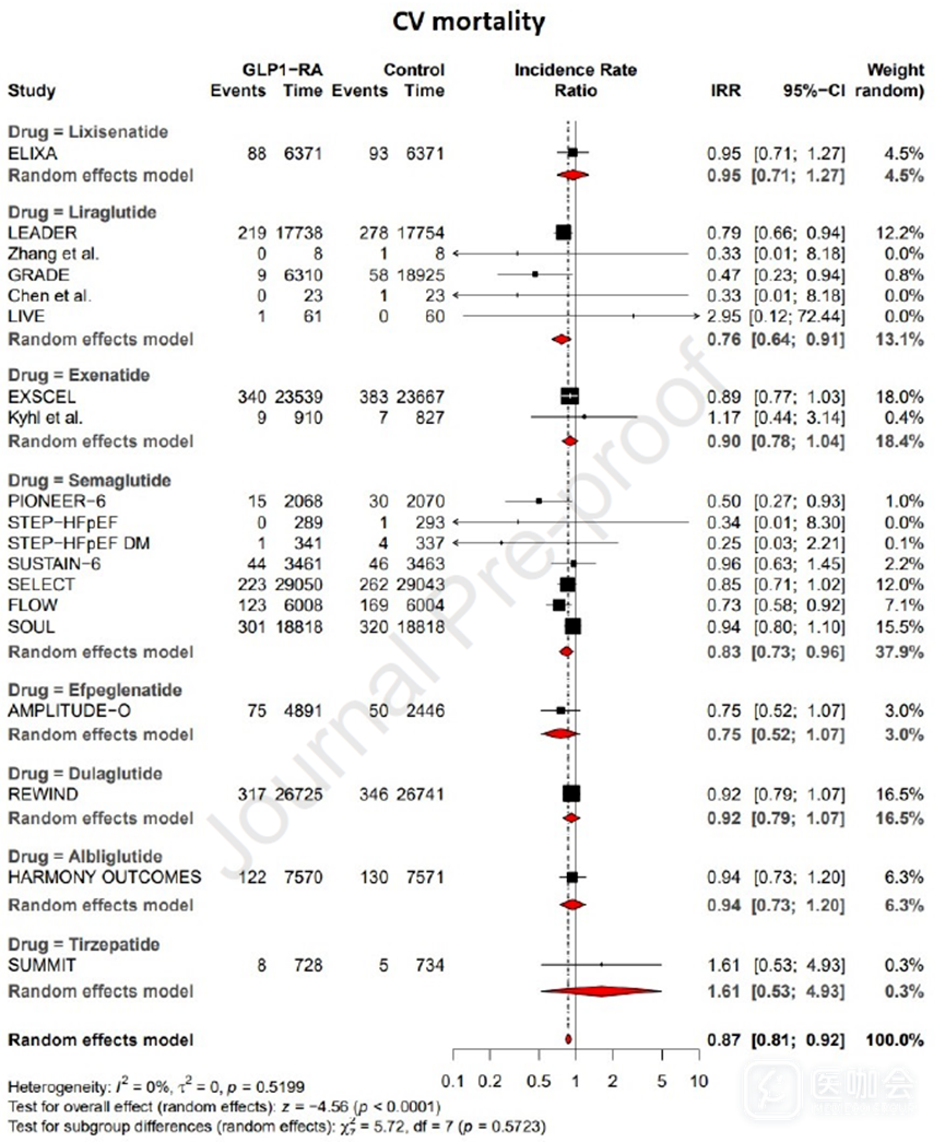 与对照组相比,GLP-1RAs组心血管死亡显著降低(IRR 0.87;95% CI 0.81–0.92;p<0.01,NNT=170,GRADE:高确定性证据)。不同亚组间无显著差异(交互作用p=0.57)。