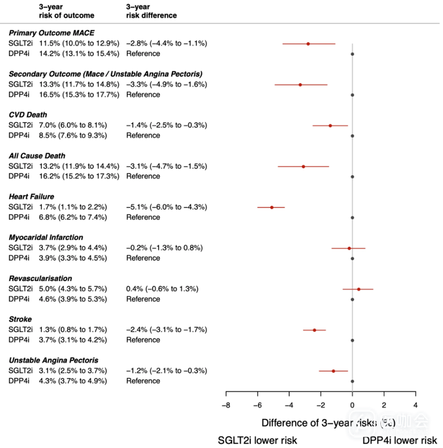 - MACE:SGLT2i组的风险为11.5%,而DPP4i组为14.2%,绝对风险差为2.8个百分点(95% CI: 1.1–4.4);三年相对风险为0.80(95% CI: 0.70–0.92)。