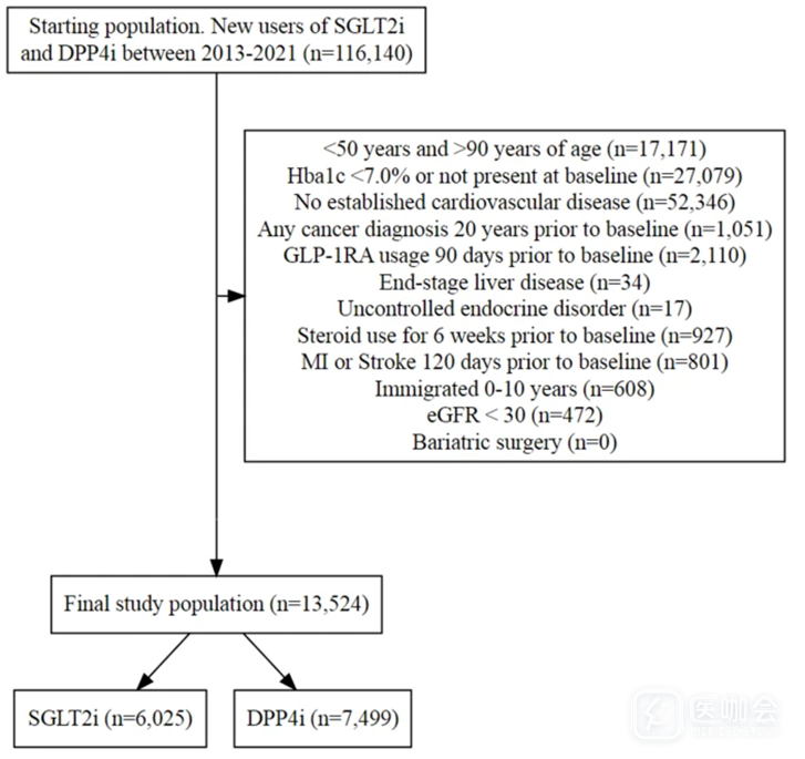 研究数据来自丹麦全国性登记数据,包括七个登记库。纳入2013-2021年首次开具SGLT2i或DPP4i处方的、满足EMPA-REG试验纳排标准的患者(详见下图)。基线数据(1993-2022年)中,个体处方中必须仅包含一个种类的药物。随访结束时间为2022年12月31日、参与者移民或死亡。
