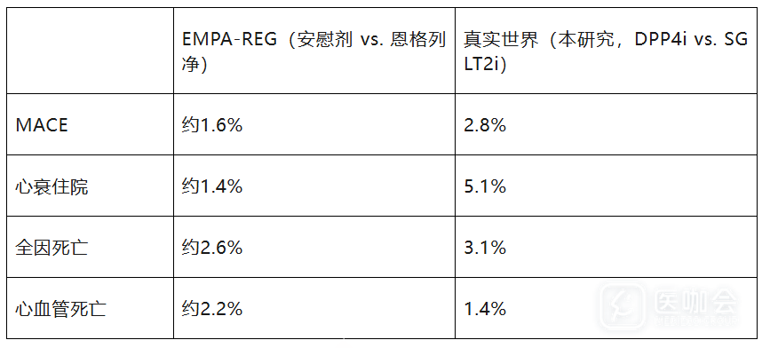 本研究利用丹麦全国性登记数据,在真实世界中对比持续使用SGLT2i与DPP4i的长期心血管影响。研究于真实世界中纳入与EMPA-REG试验相似的人群,比较RCT与真实世界的结果,并采用先进的因果推断方法报告绝对风险和风险差异,以提供临床可解释的估计值。