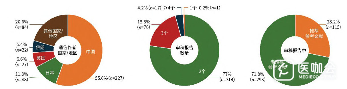 这些论文超过一半来自中国作者,绝大部分论文公布了2个或3个审稿报告。有28.2%的论文有至少一个审稿报告推荐了参考文献,71.8%的论文则没有任何一个审稿报告推荐参考文献。