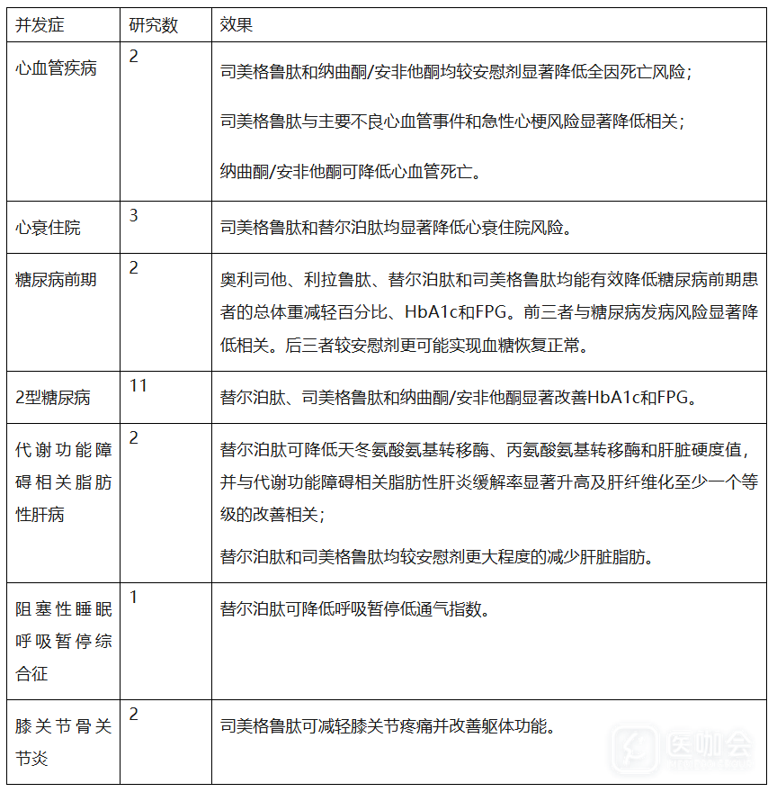 替尔泊肽显著降低呼吸暂停低通气指数,司美格鲁肽可缓解膝骨关节炎患者的疼痛和功能受限,这些效益主要源于减重本身而非药物特异性作用。