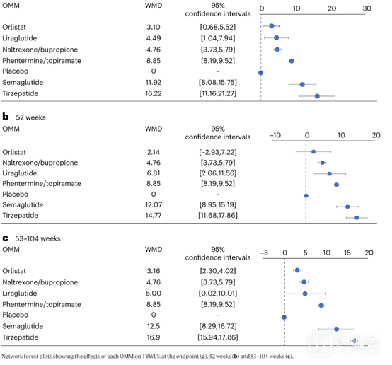 55个比较的网络Meta分析显示,与安慰剂相比,所有药物显示出统计学上显著更高的TBWL%,司美格鲁肽和替尔泊肽的TBWL%估计值>10%。
