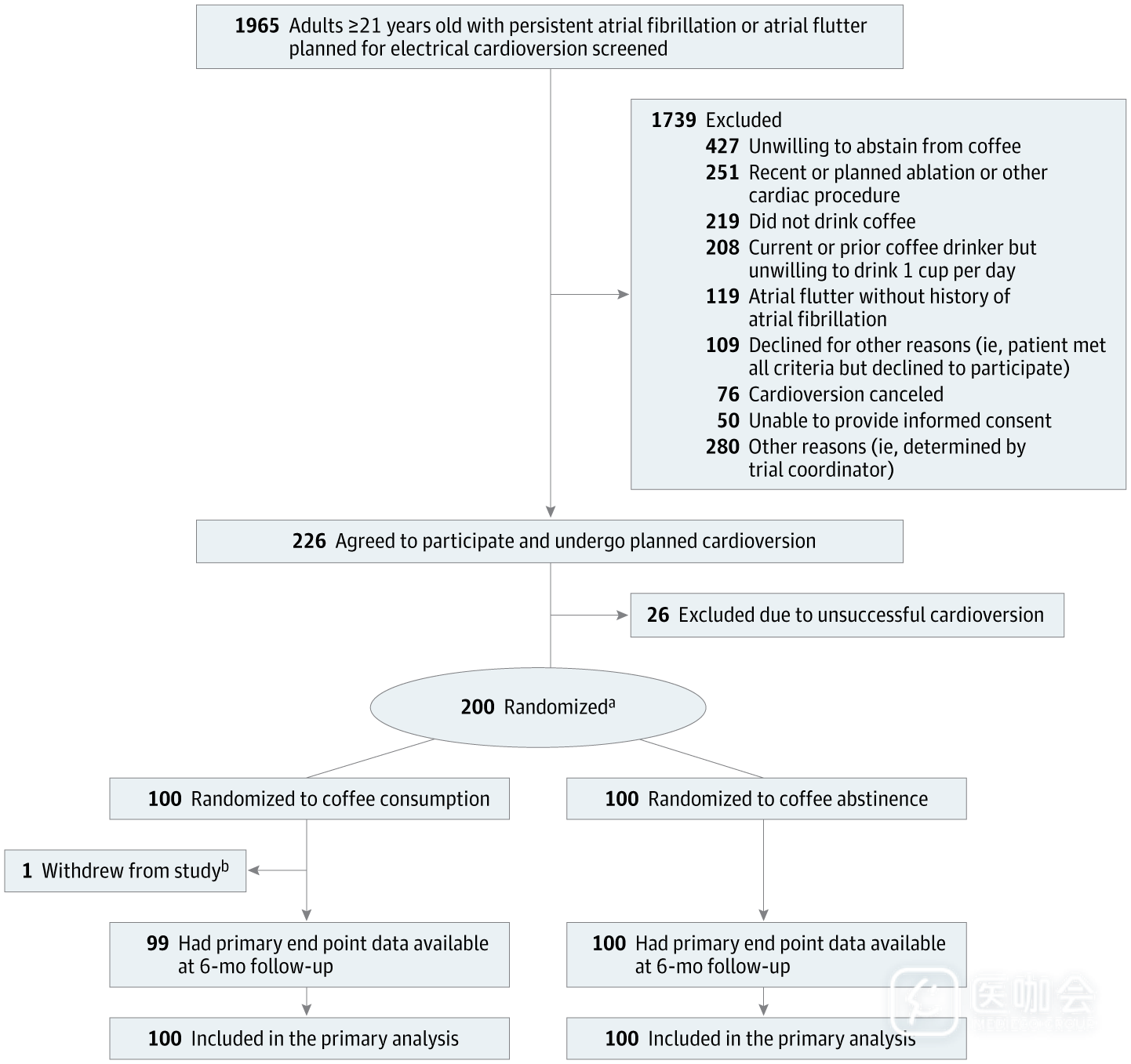 DECAF研究(Does Eliminating Coffee Avoid Fibrillation?)是一项前瞻性、开放标签、国际多中心随机临床试验。于2021年11月至2024年12月期间纳入200名当前或近5年内有饮用咖啡习惯的持续性房颤或具有房颤史的房扑成人患者,均计划接受电复律。最终随访日期为2025年6月5日。