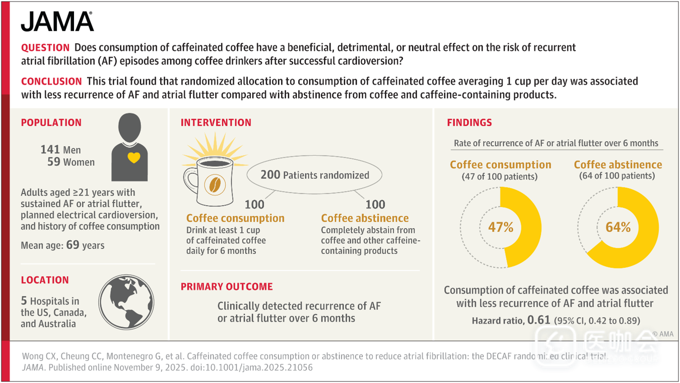 传统观点认为,含咖啡因的咖啡会促发心律失常,此前也尚无针对房颤患者摄入含咖啡因咖啡的随机试验。2025年11月9日,针对该问题的DECAF研究在JAMA上发表。研究发现:房颤成功复律后的习惯喝咖啡者,相较于开始完全禁食咖啡及咖啡因产品,每日仍平均饮用1杯含咖啡因的咖啡,与房颤或房扑复发风险降低相关。