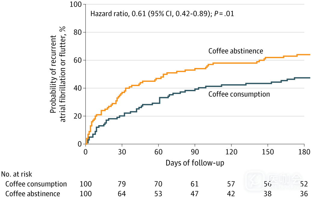调整分层因素后,意向性治疗分析显示,与禁食组相比,咖啡摄入组的复发时间显著更长,房颤或房扑复发风险降低39%( HR 0.61,95%CI 0.42-0.89;P=0.01)。在预设的敏感性分析中观察到类似获益。