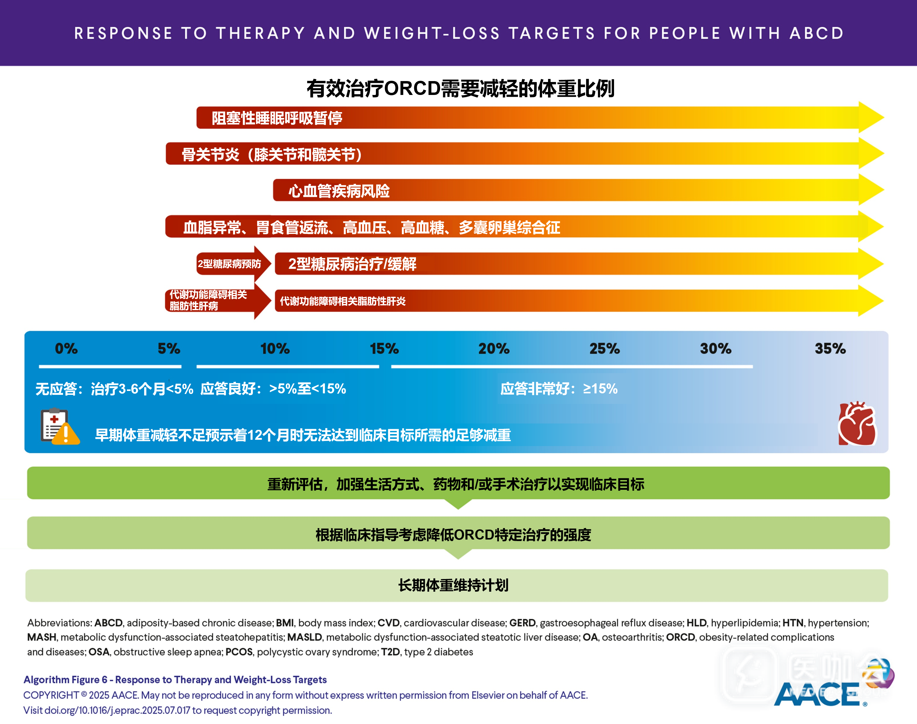 以并发症为中心的治疗中,为实现预期临床健康结局通常需要达到一定的减重目标范围。但需注意,任何干预措施的个体临床疗效均存在差异。治疗目标始终是为每位患者实现其临床改善所需的足量减重。
