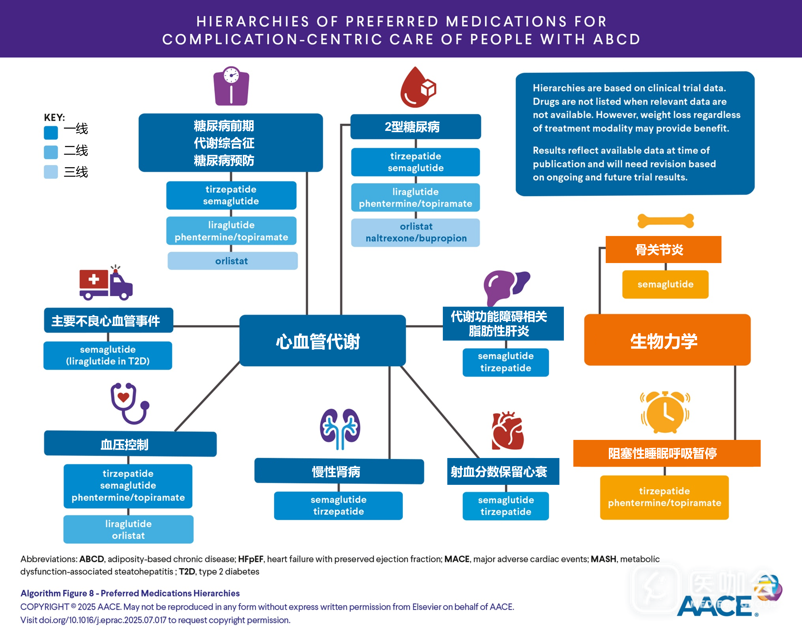 合并高血压的ABCD患者,首选替尔泊肽和司美格鲁肽,芬特明/托吡酯缓释剂紧随其后。利拉鲁肽与奥利司他为二线药物。
