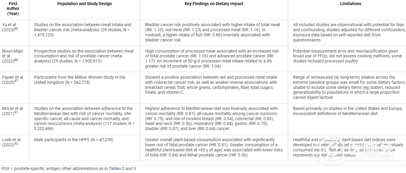 近年来,营养流行病学研究重点已从评估单一食物转向关注饮食模式(即个体长期完整膳食摄入的组合),如地中海饮食就是癌症研究中最为广泛关注的饮食模式之一。干预性和观察性研究也报道了以植物性食物为主的饮食模式在癌症风险与进展方面的积极结果。