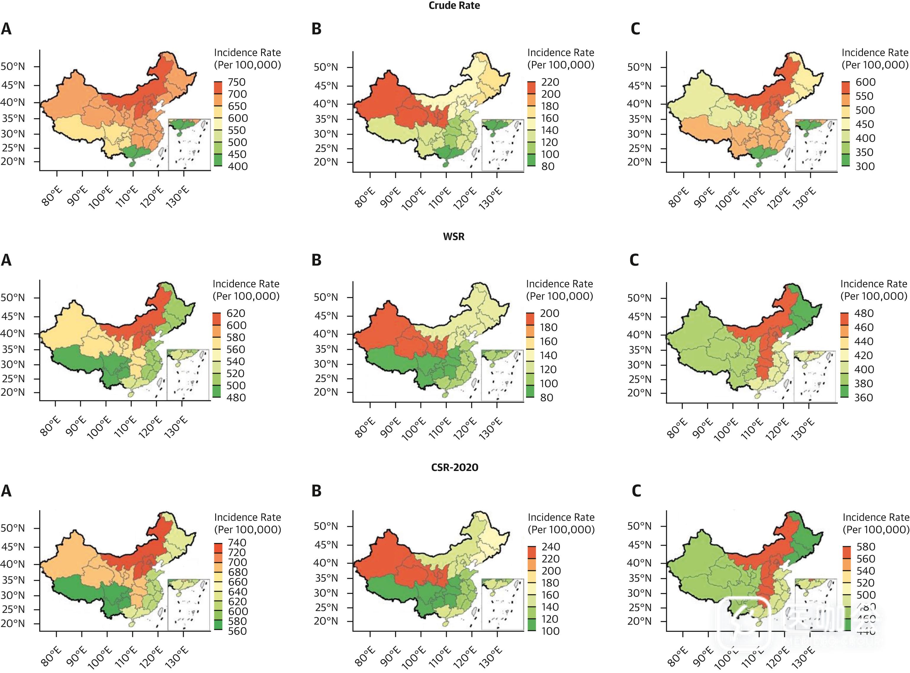 七大区域间存在显著的CVD发病率差异。华北与东北地区总体CVD粗发病率较高,华北地区的CVD年龄标化发病率(WSR与CSR)更高。西北地区冠心病疾病负担最重,华北与华中地区卒中发病率更高。
