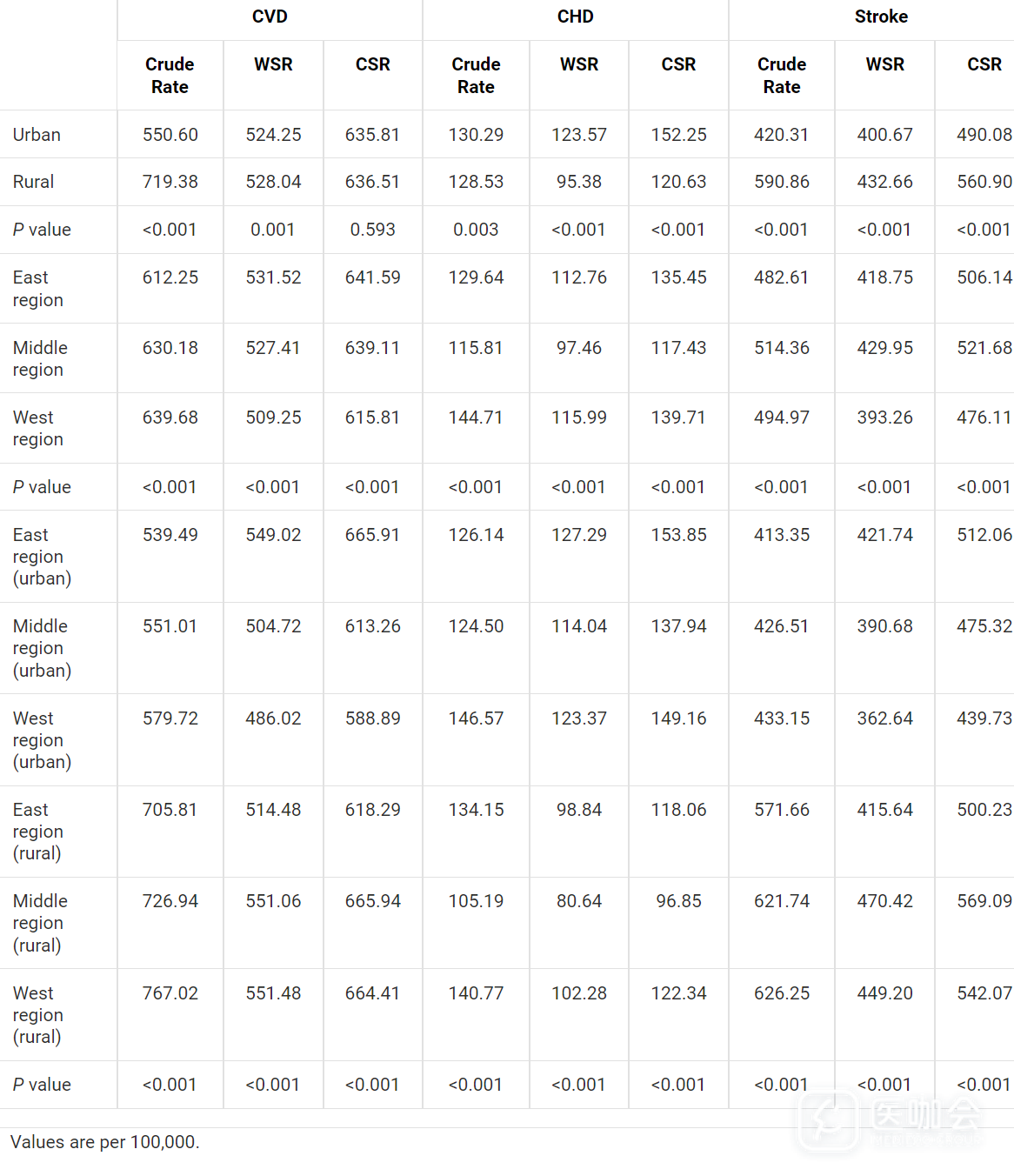 研究还发现CVD发病率存在显著地区差异,农村和西部地区发病率更高(尤其是卒中)。