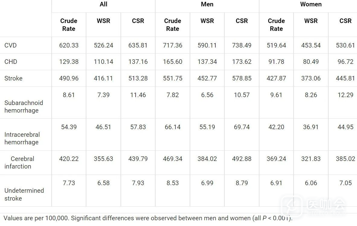 男性CVD发病率显著高于女性(粗发病率、WSR、CSR方面,性别差异均P<0.001)。除蛛网膜下腔出血例外,这种性别差异在所有CVD亚型中表现一致。