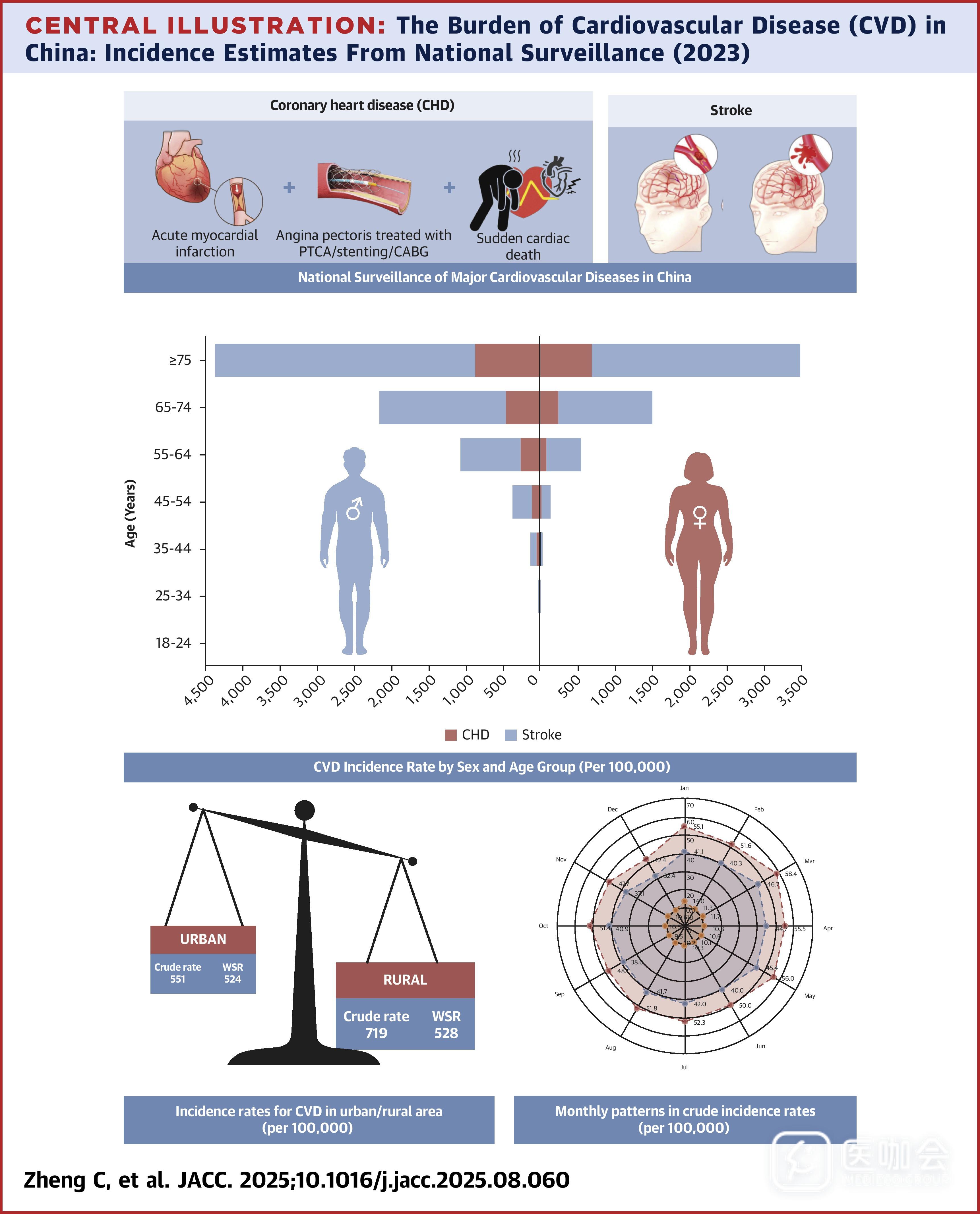 2025年11月,JACC在线发表了一项中国研究,根据全国人口心血管疾病(CVD)监测数据,评估了中国CVD的发病状况。研究表明:2023年,中国CVD粗发病率为620.33/10万,男性与老年群体的发病率更高,且存在显著的地域差异和季节波动特征。
