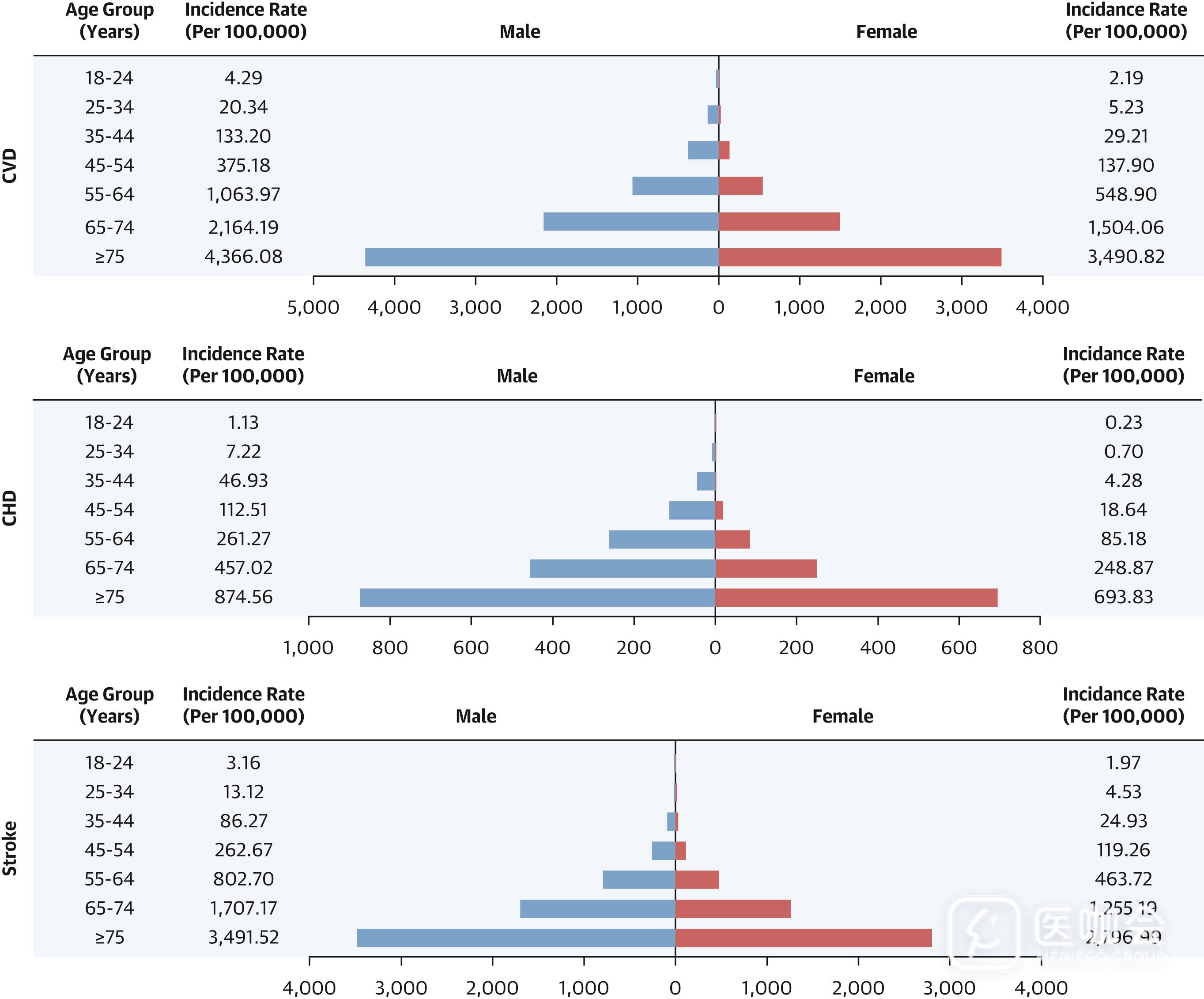 图.CVD、冠心病、卒中年龄及性别分层的发病情况