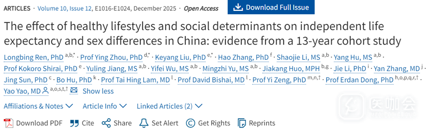 2025年11月,《LANCET Public Health》(IF=25.2)发表了一篇CLHLS数据库的分析成果,探讨了健康生活方式与健康社会决定因素如何影响预期寿命及性别差异。研究表明:两种因素可以独立或协同作用延长独立生活预期寿命。男性更多地受益于生活方式的改善,女性则更多地受益于社会决定因素的改善。