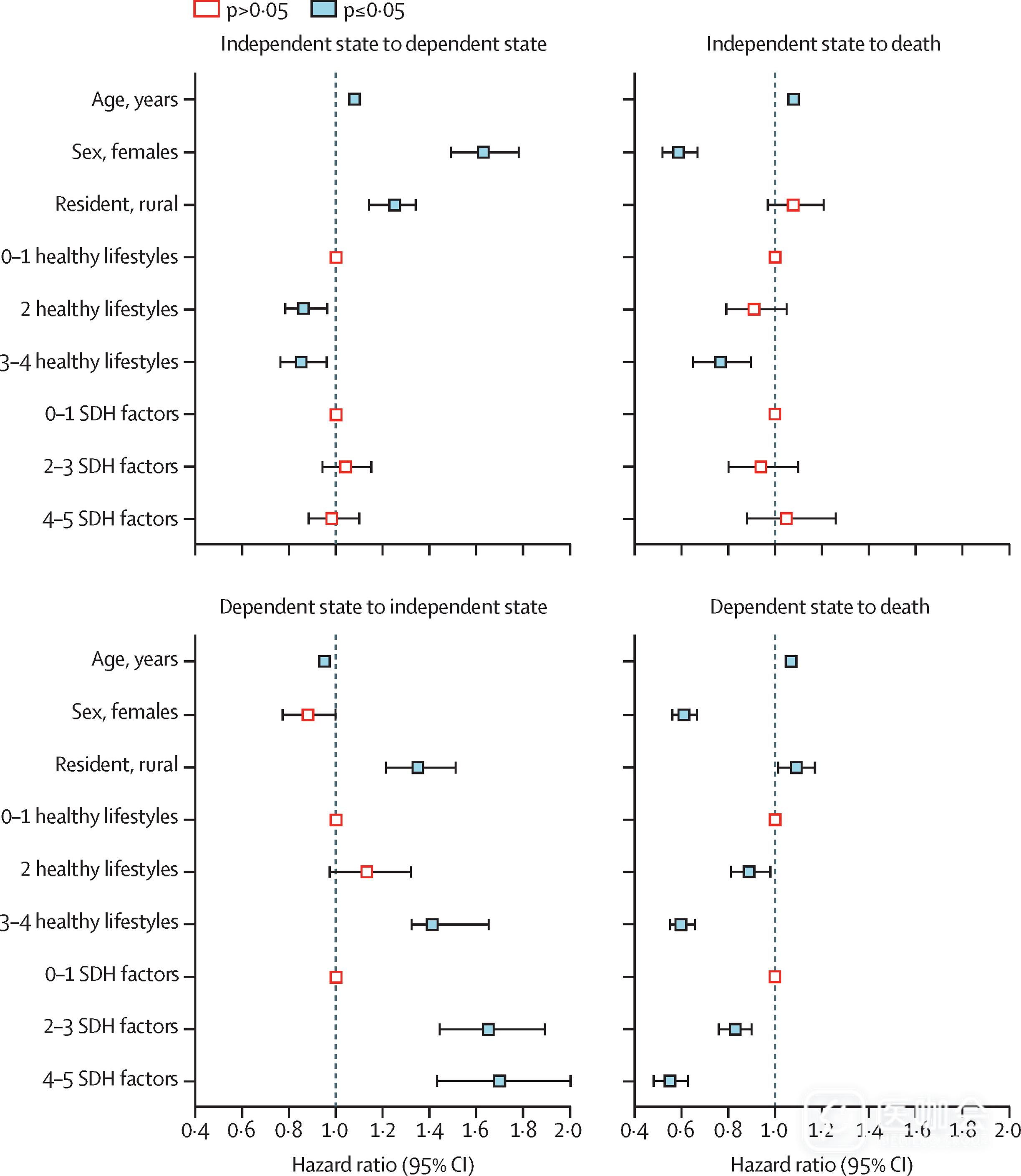 两种因素对功能状态的转换表现出不同的影响模式。健康生活方式主要防止独立功能的丧失(3-4项因素 vs 0-1项因素,HR 0.85,0.76-0.96),且降低这两种状态的死亡风险。健康社会决定因素则对非独立状态的功能恢复以及非独立状态后的生存具有更强的影响。