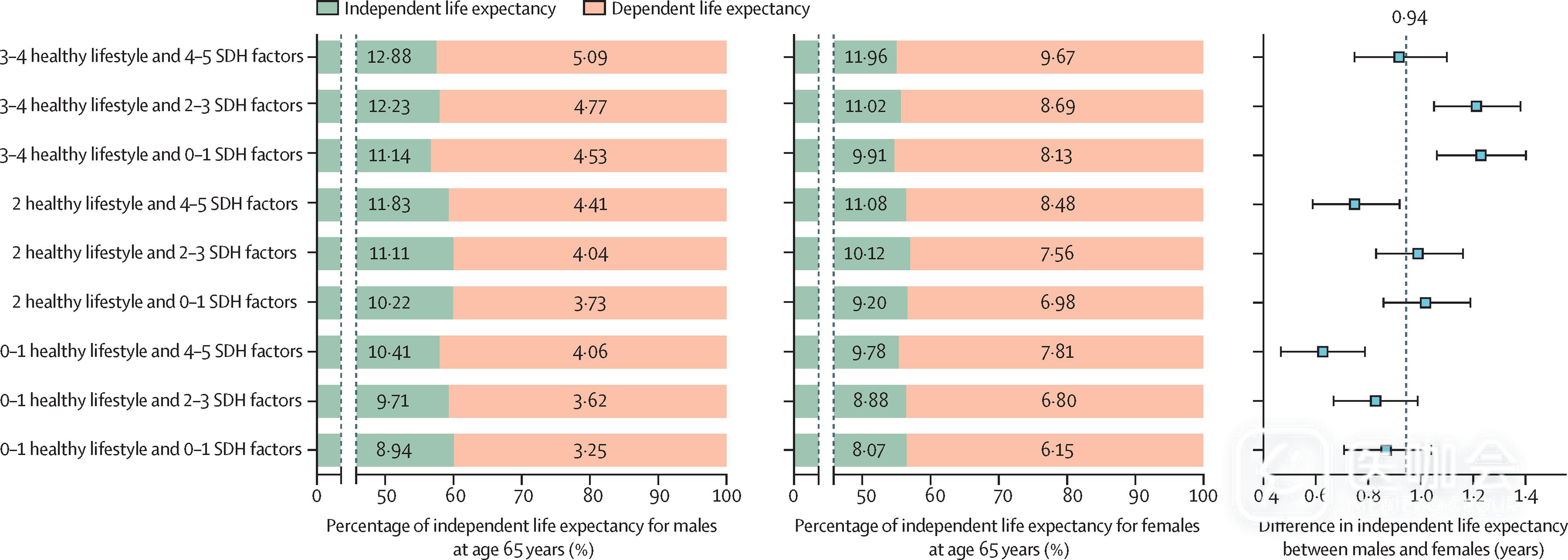 两种因素对独立生活预期寿命的影响存在显著性别差异。有3-4项健康生活方式因素的男性,独立生活预期寿命较仅有0-1项因素的男性长2.45年(95% CI 2.24-2.67),这一幅度略高于女性的2.09年(1.90-2.29, p=0.015)。有4-5项健康社会决定因素的女性,独立生活预期寿命较仅有0-1项因素的女性长1.95年(1.74-2.16),该幅度超过男性的1.67年(1.49-1.85, p=0.047)。