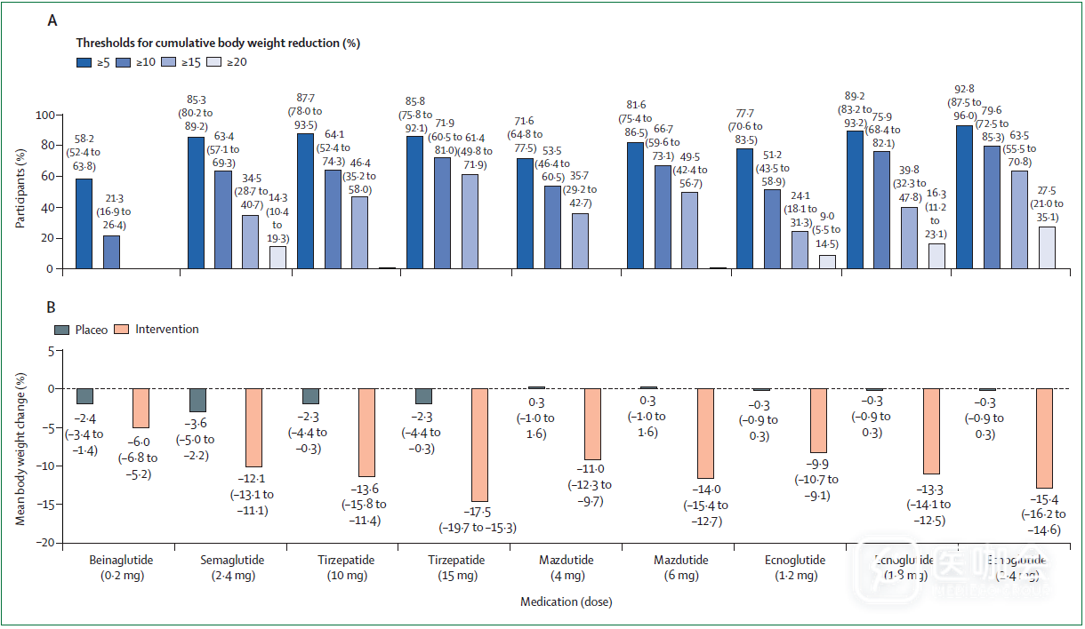 在所评估的药物中,替尔泊肽15 mg与埃诺格鲁肽2.4 mg对中国成人似乎能产生最显著的减重效果。