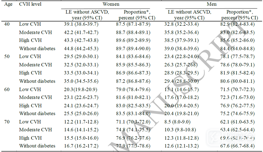 在40岁时,低CVH水平的糖尿病女性,总预期寿命为44.7年(95%CI:43.9-45.6年),其中无ASCVD的预期寿命为39.1年(38.6-39.7年)。高CVH水平的糖尿病女性,总预期寿命延长至48.2年(47.4-49.1年),无ASCVD预期寿命则为43.3年(42.7-43.8年)。非糖尿病女性的总预期寿命为50.0年(49.2-50.8年),无ASCVD预期寿命为44.8年(44.2-45.3年)。