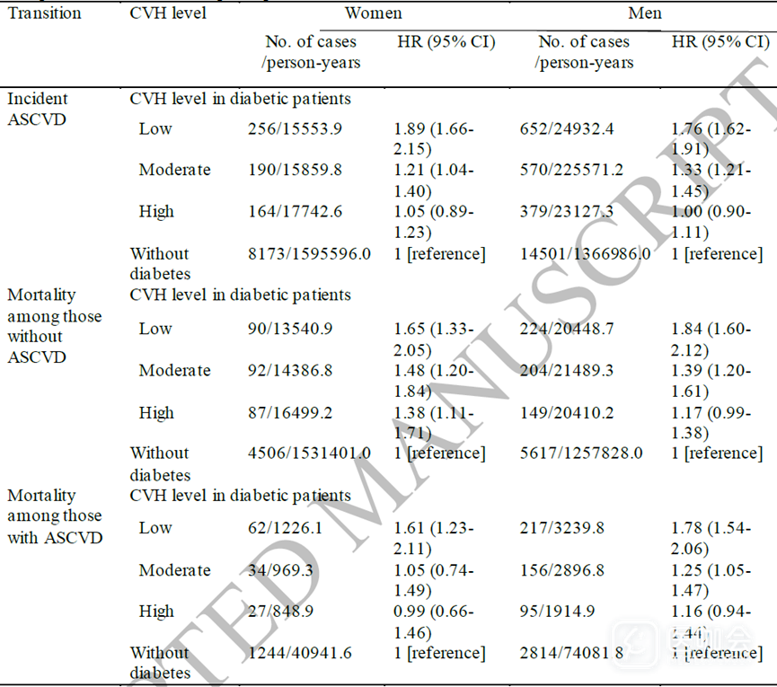 表. 以非糖尿病为对照,不同CVH水平的糖尿病患者的ASCVD和死亡风险