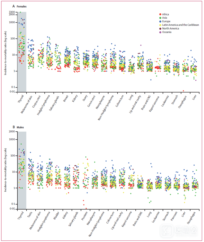 不同国家该比值差异很大,高比值主要集中在极高或高HDI国家,并且主要来自亚洲、欧洲和北美。低比值则主要是在低HDI国家和非洲国家。与其他部位癌症相比,甲状腺癌的发病-死亡比异常高,其他癌症大多数国家的比值在1-10之间。