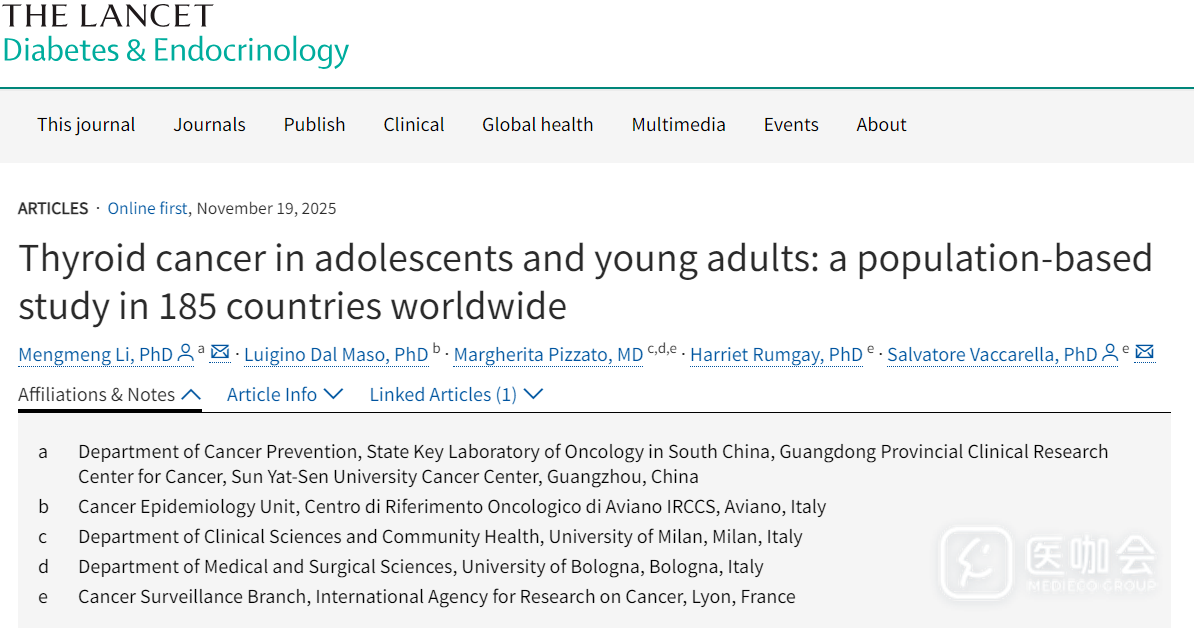 2025年11月,《Lancet Diabetes & Endocrinology》发表了一篇文章,评估了年龄15-39岁的青少年和年轻成人(AYAs)的甲状腺癌负担。研究发现:自2000年以来,AYAs甲状腺癌发病率快速上升,甲状腺癌的过度诊断问题已扩展到年轻人群。