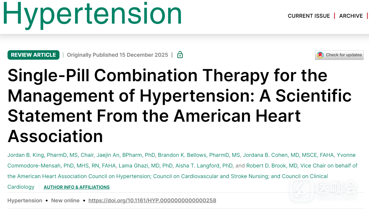 2025年12月15日,《Hypertension》期刊发表了美国心脏协会(AHA)的一项科学声明,对单片复方制剂治疗高血压进行了综述,并强调将单片复方制剂整合到临床实践中的策略。