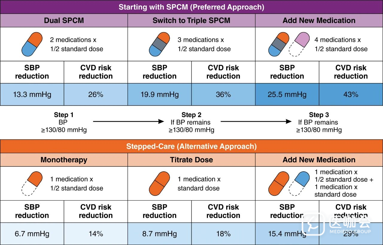 过去,阶梯治疗(起始单药治疗,随后根据需要来调整剂量或添加新药)是主要高血压指南推荐的核心策略,尤其是在20世纪70年代至90年代。近年来的指南越来越多推荐起始即采用联合治疗(分用片剂或单片复方制剂),因其安全有效,能减少治疗惰性,并能更快实现血压控制。