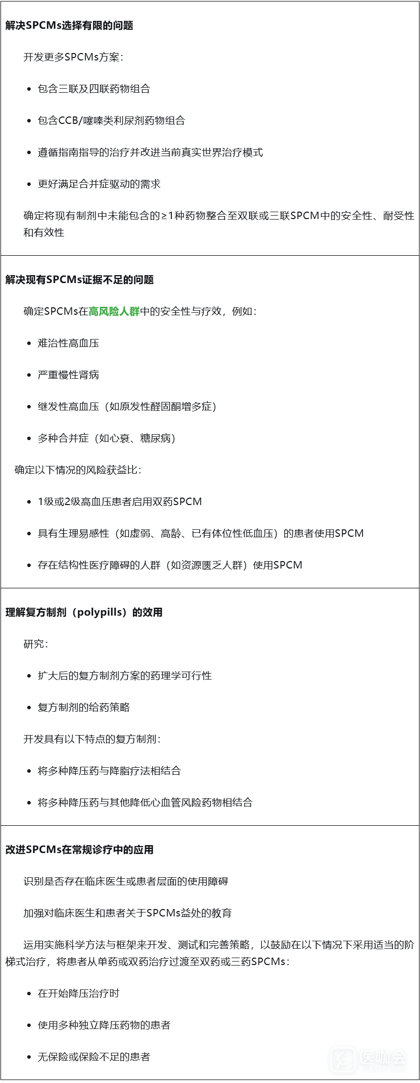为促进单片复方制剂的广泛应用,需填补很多证据空白(见下表)。例如,目前需要更多三药及四药的单片复方制剂方案,以满足需使用≥3种降压药物的患者需求。此外,多数临床试验和Meta分析仅纳入了无合并症的高血压患者,提示未来临床研究需更多纳入合并其他疾病人群的必要性。同时,需开展研究探索策略,提升临床医生对单片复方制剂的处方率和患者的接受度,此类研究可以探索干预措施在真实世界不同场景中的实际效果。