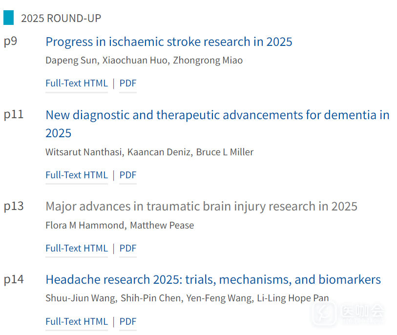 一年一度的“柳叶刀神经病学大盘点”来啦!最新一期《柳叶刀神经病学》杂志在“2025 ROUND-UP”栏目中,对2025年度神经病学研究进展进行了大盘点,共包括11篇文章,快来看看有没有你感兴趣的领域。