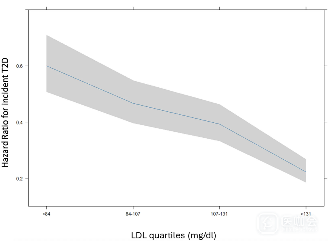 在本研究背景下,长期随访观察到LDL-C水平与新发T2D之间存在明确的负相关:LDL-C<84 mg/dL的个体T2D风险最高,LDL-C>131 mg/dL者风险最低,这一现象可能反映了特定遗传变异的影响。