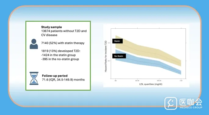 研究分析了202,545例患者的健康记录,纳排后最终队列包含13,674名参与者。参与者平均62岁,58%为男性,平均基线LDL-C为105 mg/dL,52%的参与者接受了他汀类药物治疗。中位随访71.6个月(IQR 34.5–149.9),发生1,819例T2D。