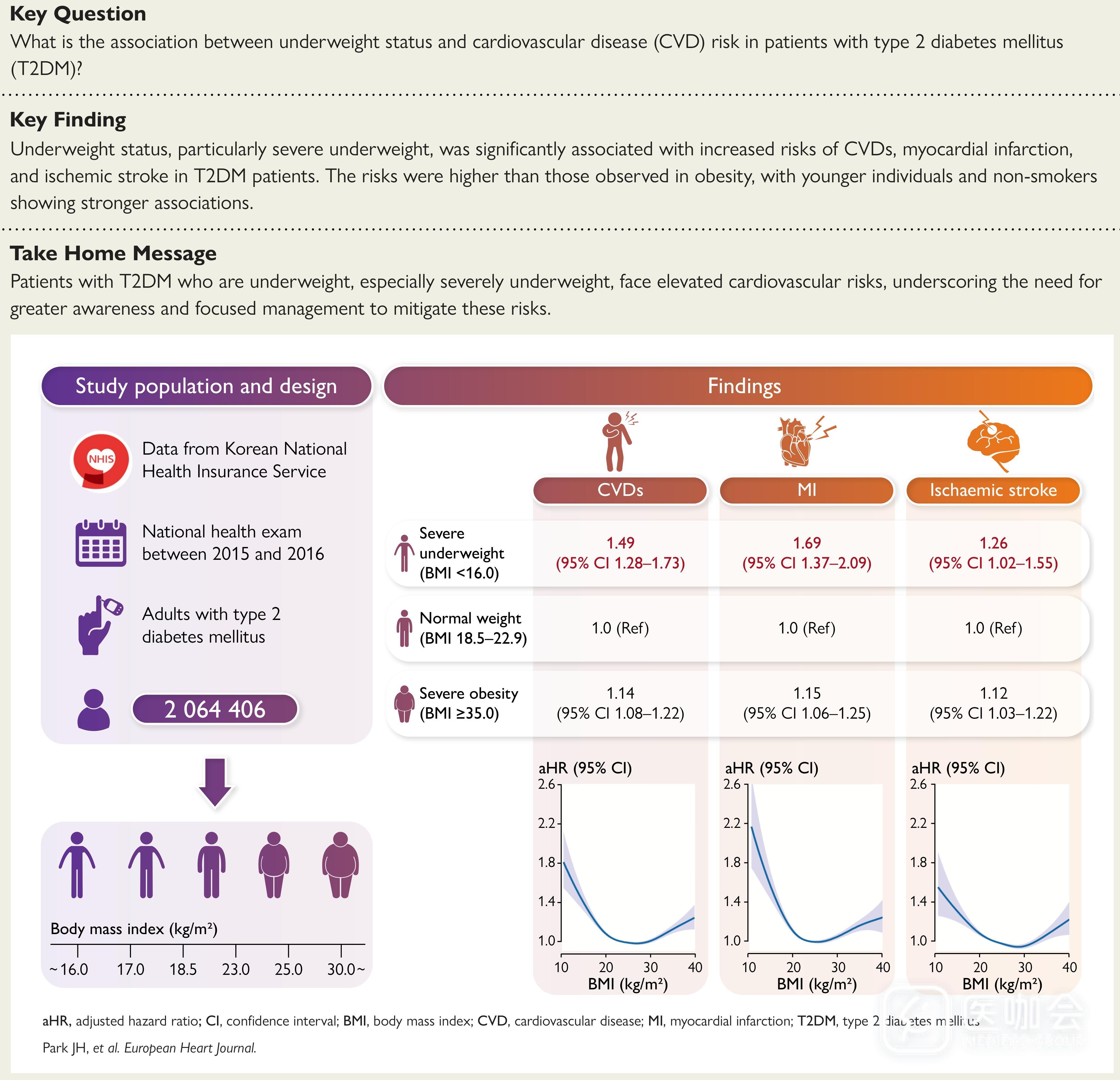 2025年11月,EHJ发表了一项研究,通过韩国全国性队列研究的数据,探讨2型糖尿病患者中低体重(underweight)与心血管疾病风险的关联。研究显示:2型糖尿病患者中,低体重与心血管疾病风险增加显著相关,重度低体重的风险甚至超过肥胖。