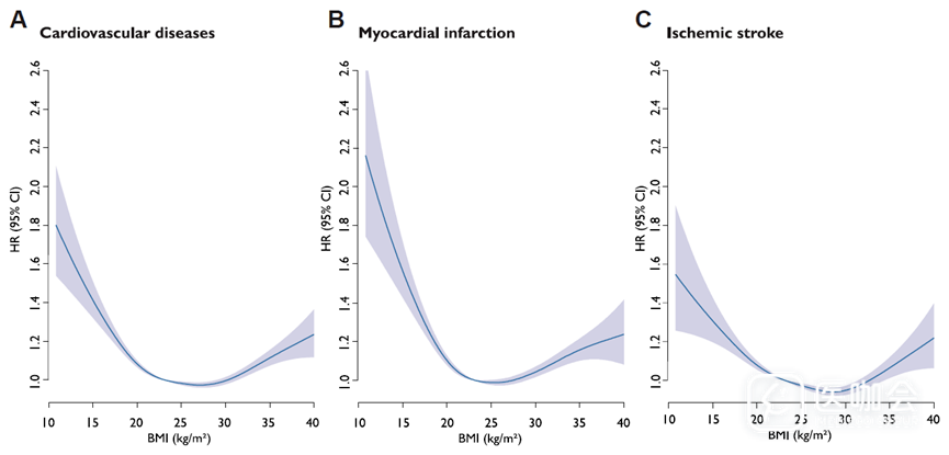 图.BMI作为连续变量与CVD、心梗、缺血性卒中的关联