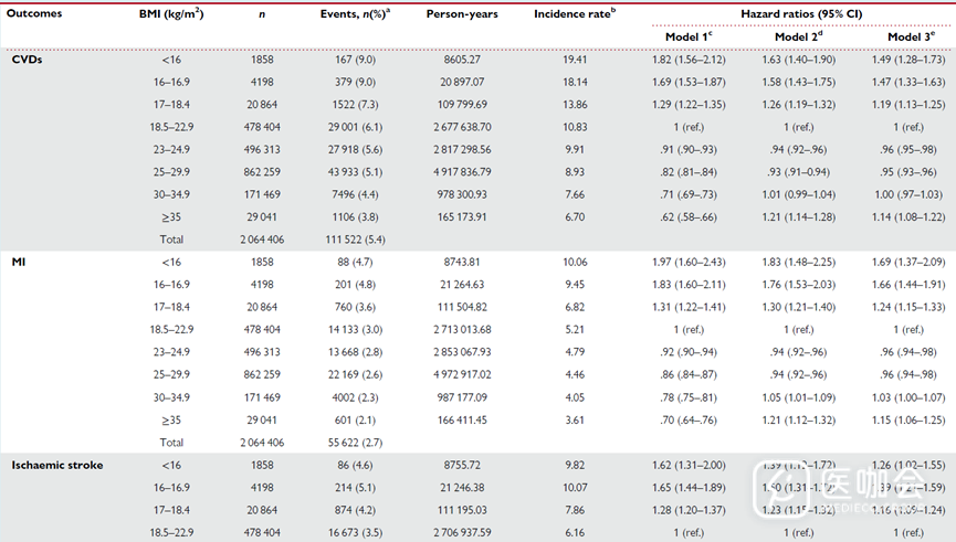 本研究利用大规模全国性队列数据,调查了T2DM患者中主要CVD(包括心梗和缺血性卒中)的风险与BMI的关联,并对低体重基于BMI进一步分层。