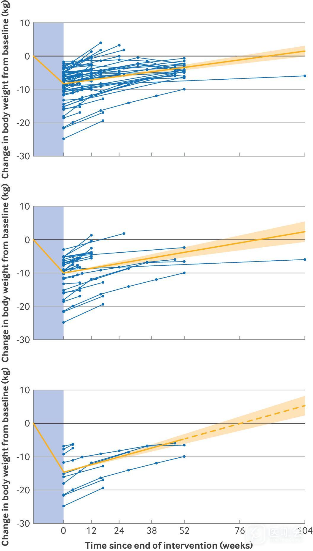 图2. 所有减重药物(上)、所有肠促胰素类似物(中)及新型高效肠促胰素类似物(司美格鲁肽与替尔泊肽)(下)的研究中,受试者体重相对于基线(治疗起始时)的变化(kg)。实线橙色曲线显示治疗期间(蓝色阴影区域)的减重量以及治疗后的体重反弹速度(95%CI),由混合效应模型(模型1)估算得出;虚线橙色曲线为模型预测线的延伸,用于展示体重恢复至基线所需的时间(因新型高效肠促胰素类似物缺乏52周后的随访数据);蓝色曲线代表纳入分析的各项独立研究数据。