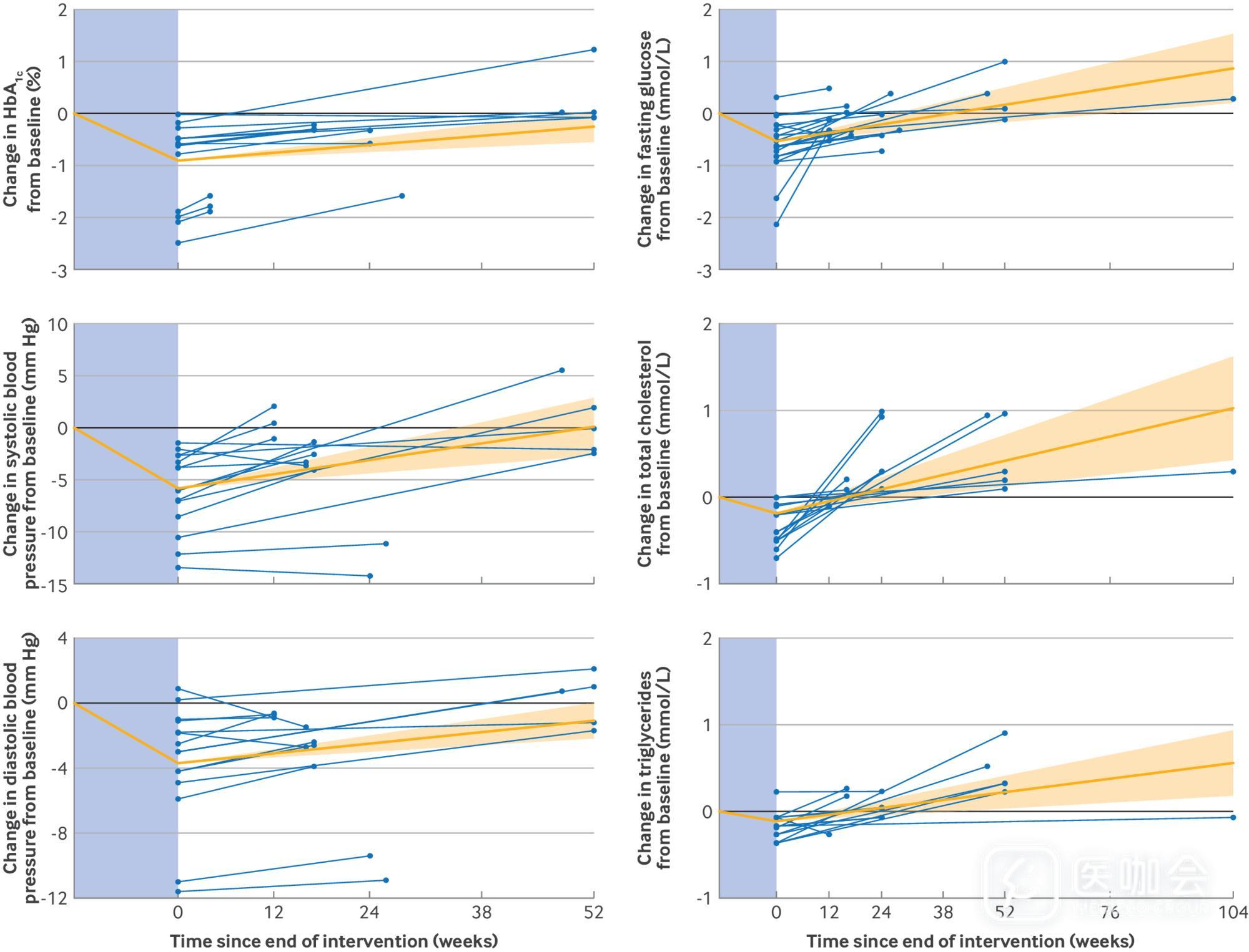 图4. 本综述纳入的所有研究中,心脏代谢指标相对于基线(治疗起始时)的变化情况。实线橙色曲线显示治疗期间(蓝色阴影区域)的变化量及治疗结束后指标变化率(95%CI),由混合效应模型(模型1)估算得出;蓝色曲线代表纳入分析的各项独立研究的数据。