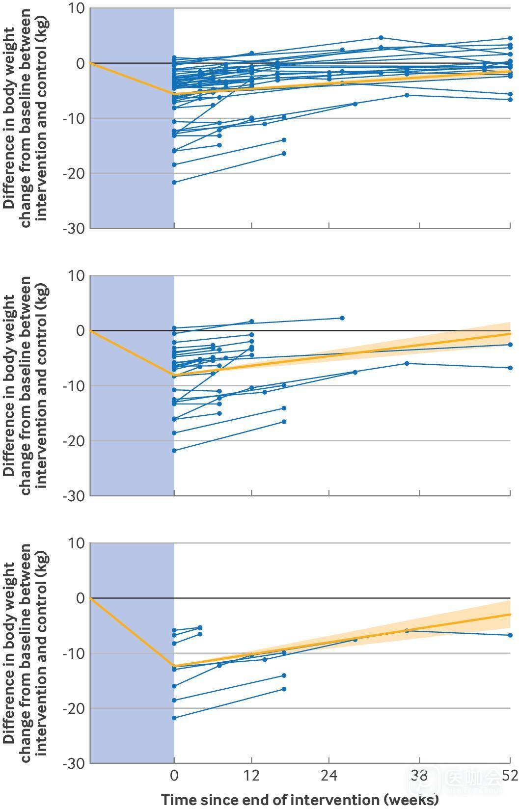 图3. 在所有减重药物(上)、所有肠促胰素类似物(中)、新型高效肠促胰素类似物(司美格鲁肽与替尔泊肽)(下)的随机对照试验中,干预组与对照组体重相对于基线变化的差异(kg)。实线橙色曲线显示治疗期间(蓝色阴影区域)相对于对照组的减重量,以及治疗结束后相对于对照组的体重反弹速度(95%CI),由混合效应模型(模型1)估算得出;蓝色曲线代表纳入分析的各项研究中,干预组相对于对照组的体重变化情况。