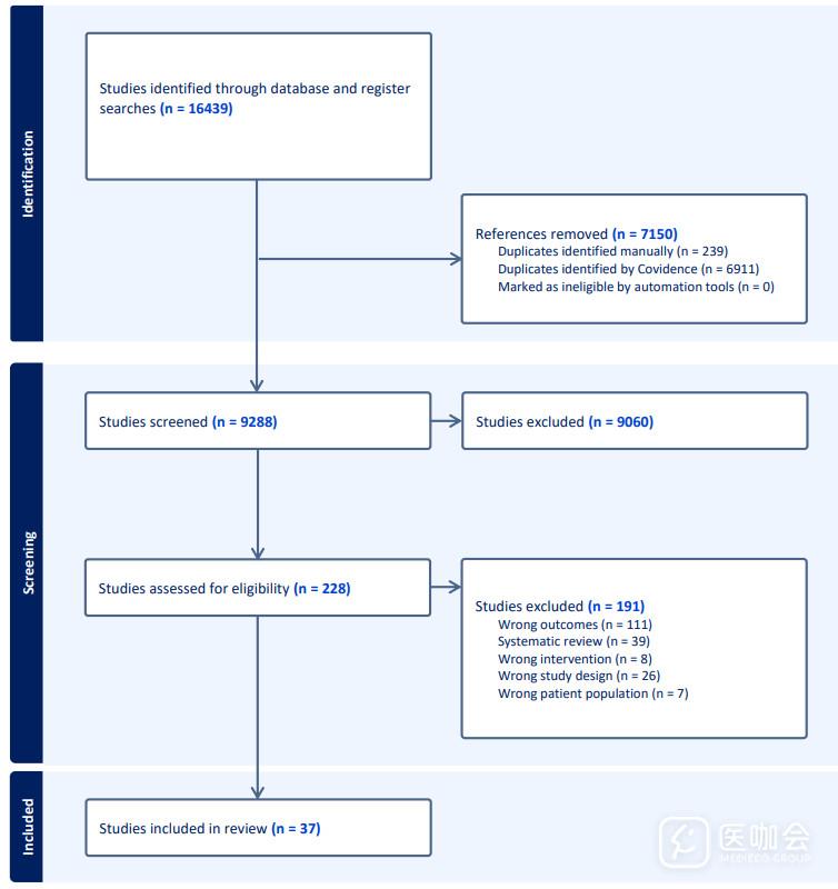 经过去重后,研究共筛选了9288篇文献的标题与摘要,并对228篇全文进行了评估(图1),最终共纳入37项研究(含63个干预组,9341名参与者)。35项为随机对照试验,其中28项在干预期与随访期均设有对照组,被纳入随机对照试验的专项分析。那些未在两个阶段均设对照组的随机对照试验,在分析中按单臂试验处理。