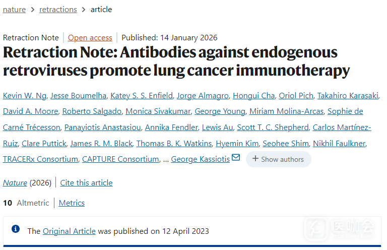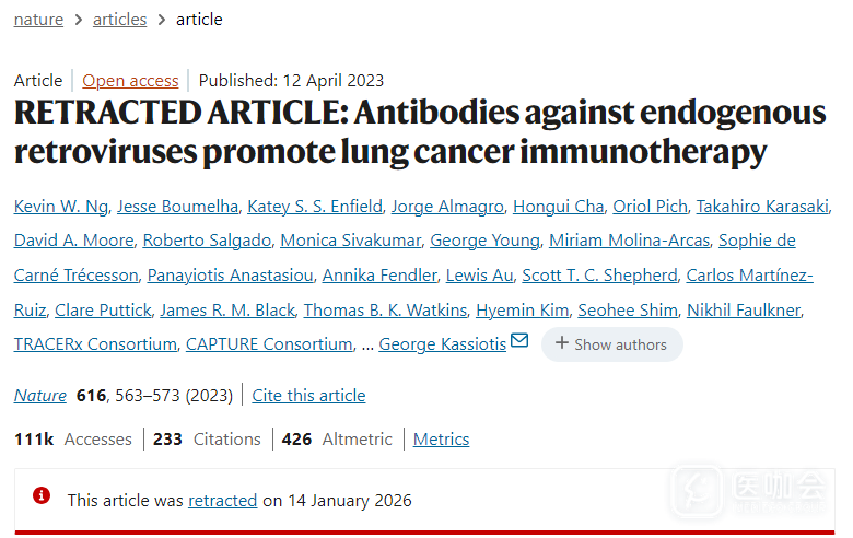 2026年1月14日,《Nature》撤回了一篇关于“肺癌对免疫疗法敏感性”的研究,该研究于2023年4月发表,已被引用192次。撤稿原因是调查发现该论文的第一作者(当时还是一名博士研究生)篡改了数据。