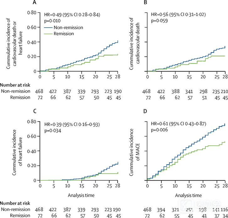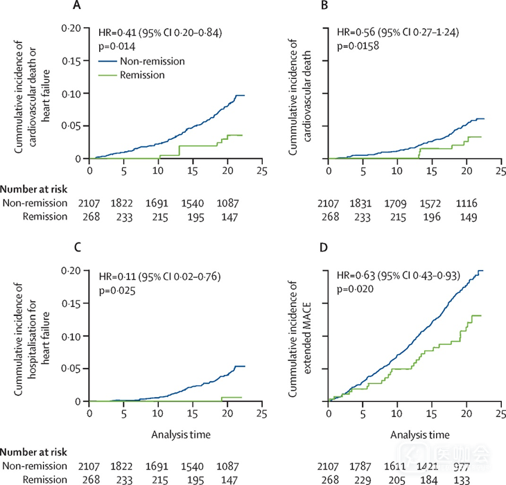 DPPOS主要终点为心血管死亡或心衰住院的复合事件。次要终点为扩展主要不良心血管事件(MACE,包括心血管死亡、非致死性心梗、非致死性卒中、冠脉或外周血管血运重建、心衰或不稳定型心绞痛住院、新诊断冠心病或无症状心梗)、心血管死亡、心衰住院、MACE(非致死性心梗、非致死性卒中或心血管死亡)及全因死亡率。同时分析了DPPOS中随访期间至少达到一次缓解是否与长期心血管结局相关。