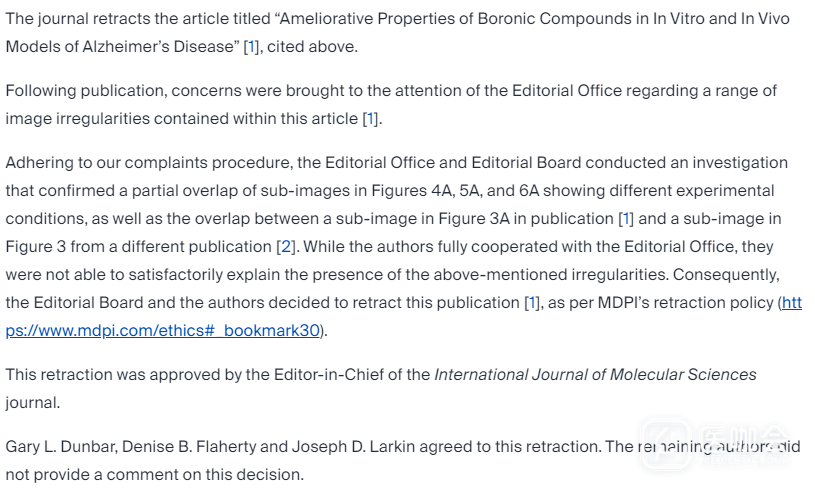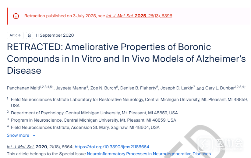 这篇2025年被撤稿的论文,在2020年发表于《International Journal of Molecular Sciences》上(IF=4.9)。该论文提出,硼化合物或可通过减少神经炎症和淀粉样蛋白斑块,预防小鼠阿尔茨海默样病理变化。据Web of Science,该论文已被引用24次。