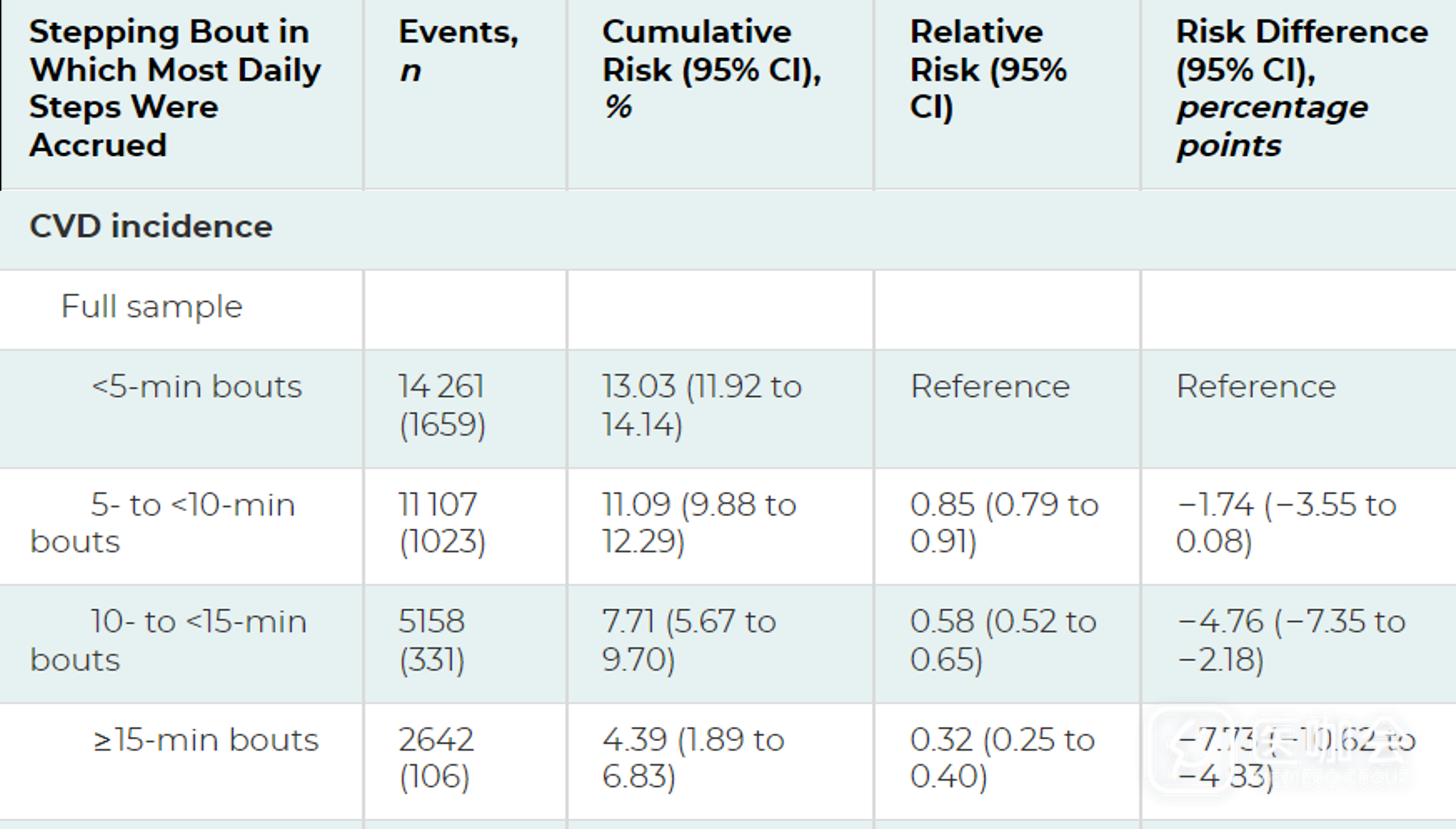 在每日步数低于推荐水平,即不超过8000步的人群中,与每日通过短时间、间歇性活动积累步数相比,将步数集中在较长时间活动段中的人全因死亡和新发CVD风险更低。这种差异在久坐组,即活动量<5000步/日的人群中更为显著。